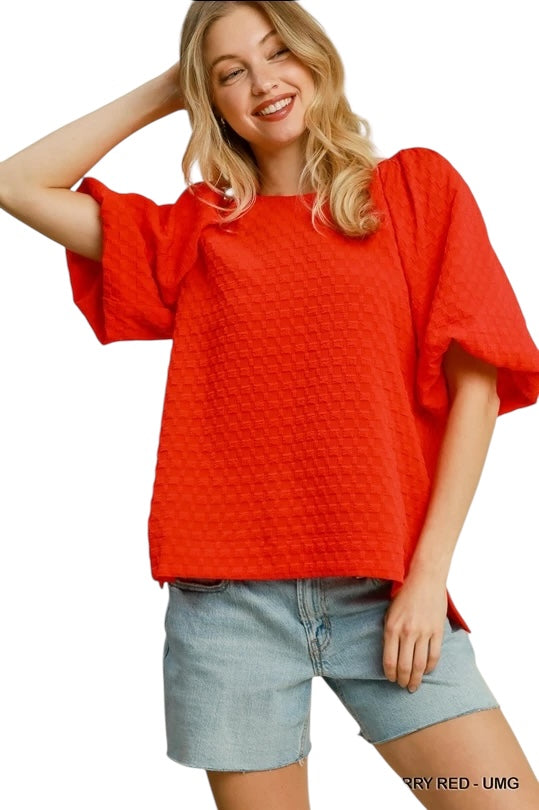 The Coming Together Red Top showcases a sophisticated jacquard fabric with a timeless round neckline. Its puff-detailed sleeves add a graceful dimension, blending classic elegance with contemporary style. Perfect for elevating your look with subtle refinement.