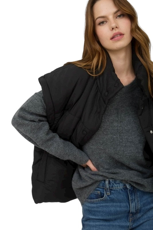 This black puff vest is the perfect addition to any outfit. With an oversized fit and snap button front, it adds both stylish layers and warmth. Upgrade your wardrobe with this polished and versatile vest.