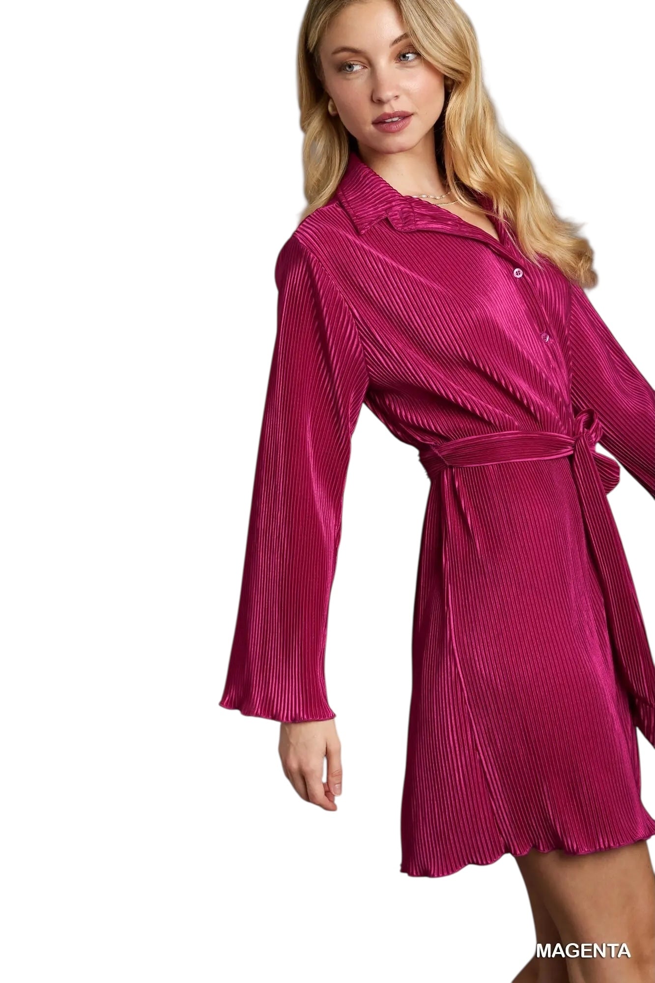 Make an entrance in this magenta dress, where timeless design meets modern sophistication. Long sleeves frame the silhouette with understated elegance, while the belted waist creates a striking focal point that flatters every figure. The button-front closure provides versatile styling options—keep it buttoned for formal occasions or open it slightly for a more relaxed, layered aesthetic. A refined choice for evening events and special occasions.