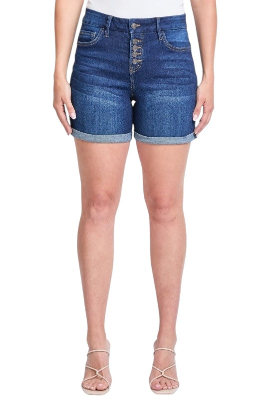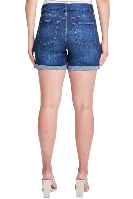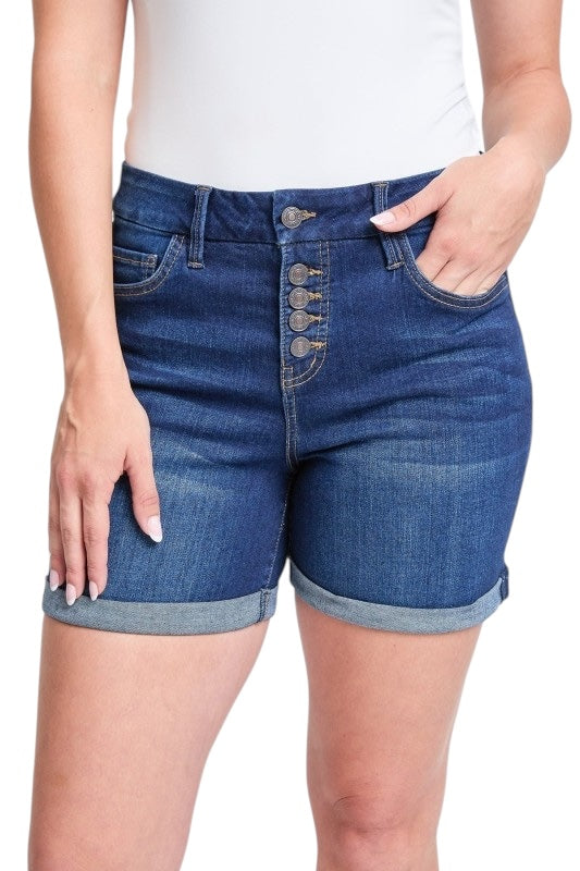 These high-rise denim shorts are designed to flatter curvy figures with a tailored fit that enhances your silhouette. Featuring a stylish button fly and cuffed hems, they combine classic details with modern ease. The stretch denim fabric ensures comfort and flexibility, making them an ideal choice for effortless travel style.