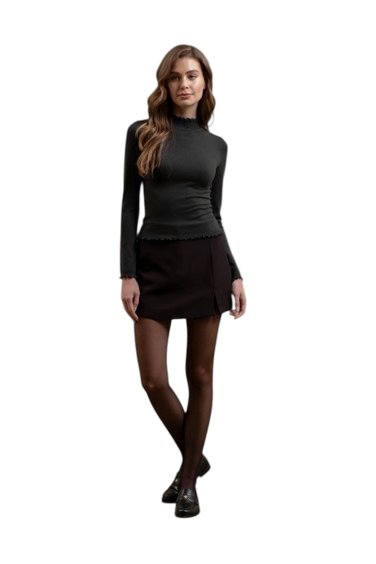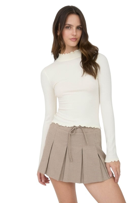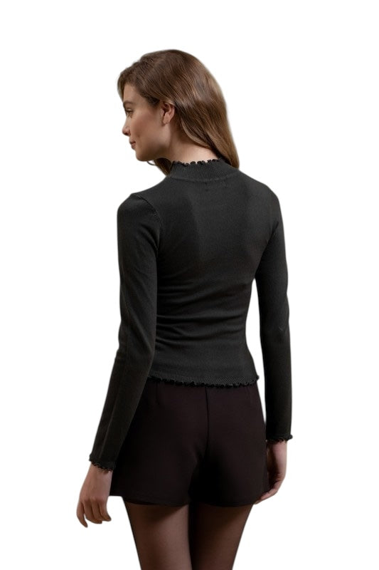 This long sleeve mock neck sweater top radiates a cheerful vibe with its ruffled thin trim. Perfect for adding a touch of playfulness to your wardrobe, it offers both style and comfort in one piece. Stay cozy and trendy with our Nice And Happy Top.