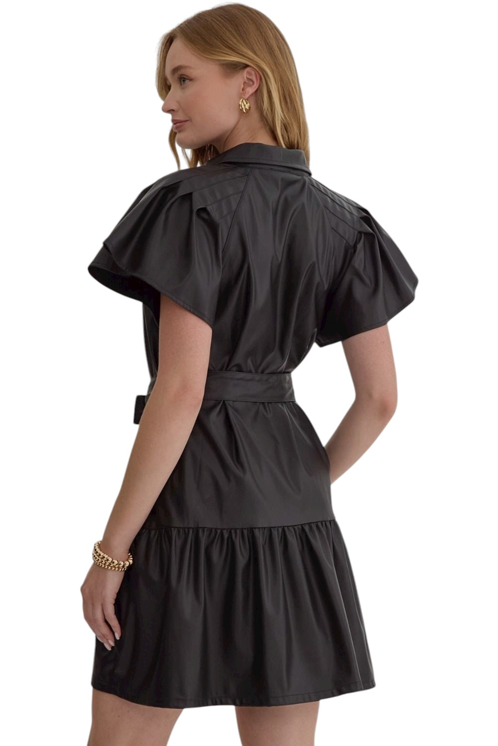 Indulge in the luxury of our She Is So Posh Black Dress. This faux leather dress features a button-down design and short sleeves, accented by a self-tie detail at the waist. Lightweight and unlined, it is perfect for any occasion. Exude sophistication and elegance in this exclusive piece.