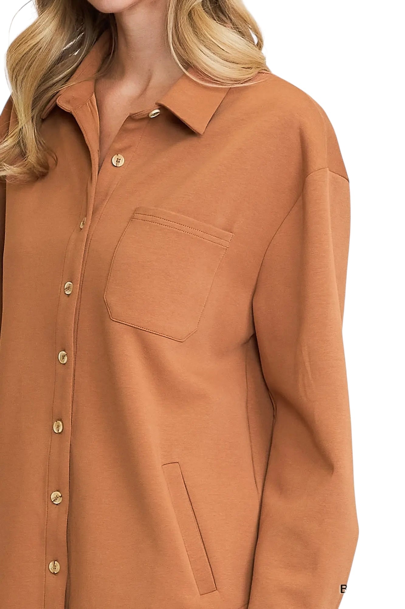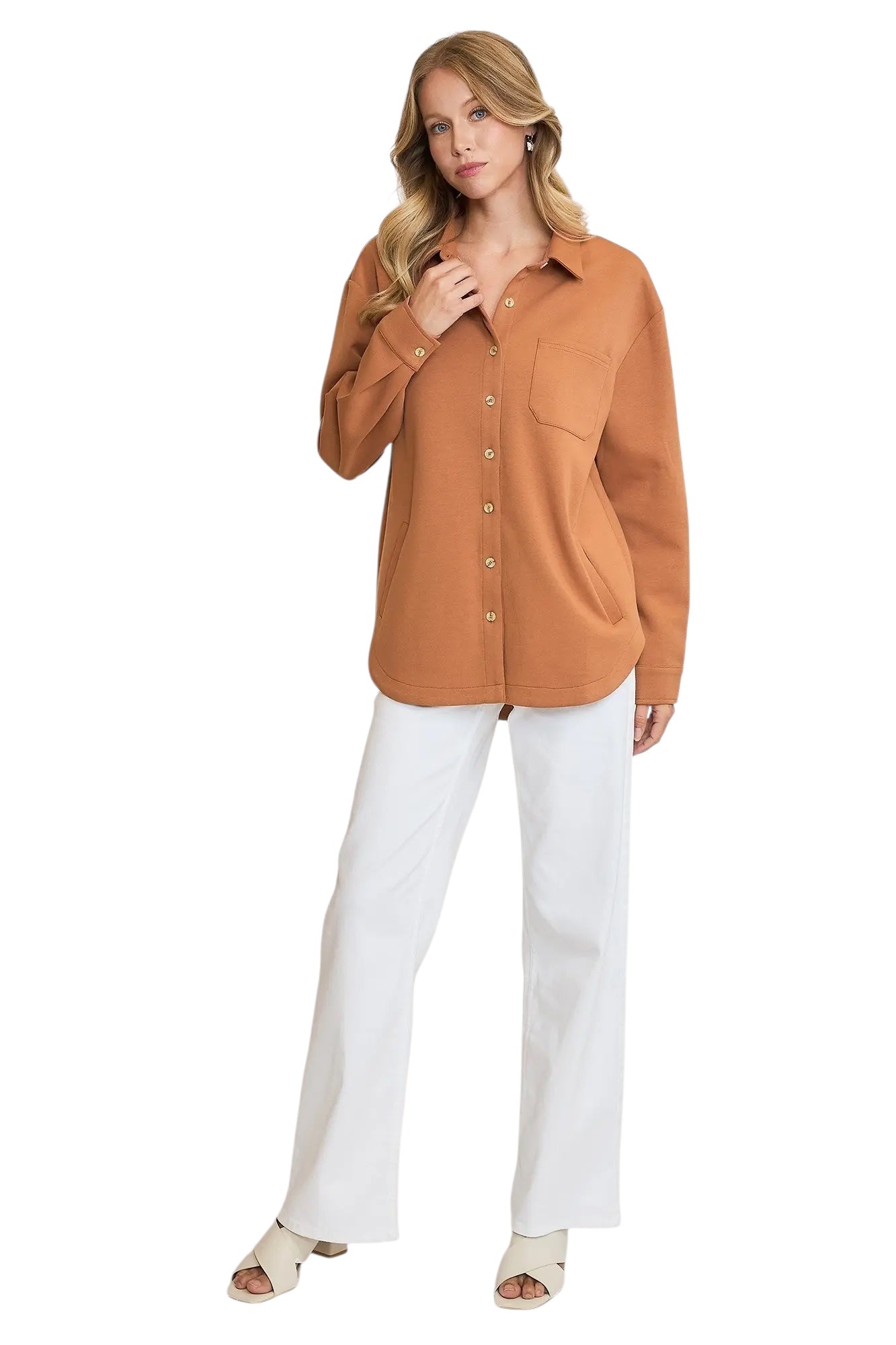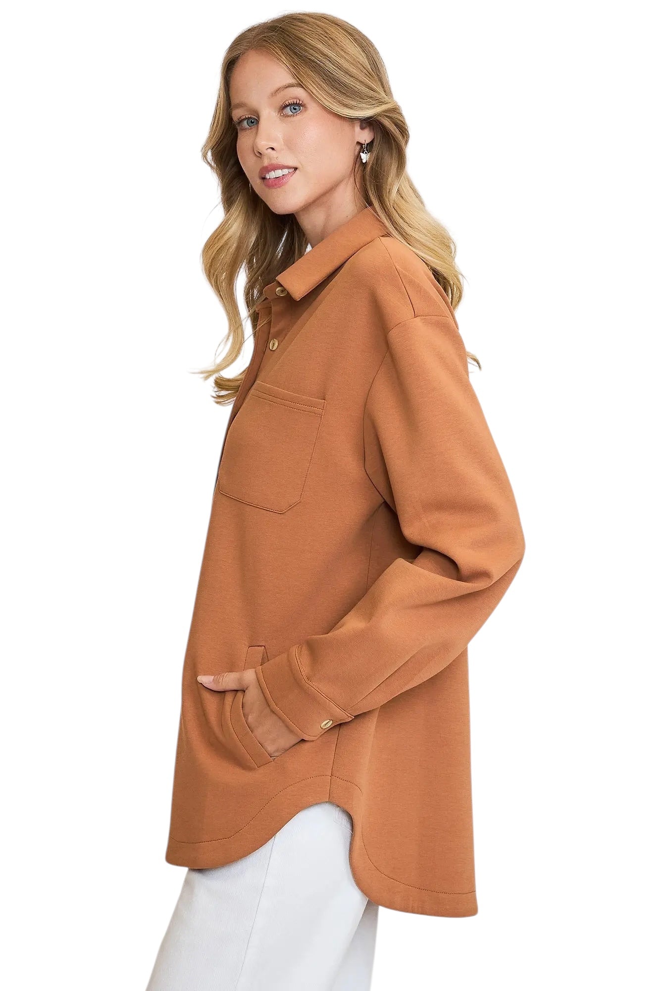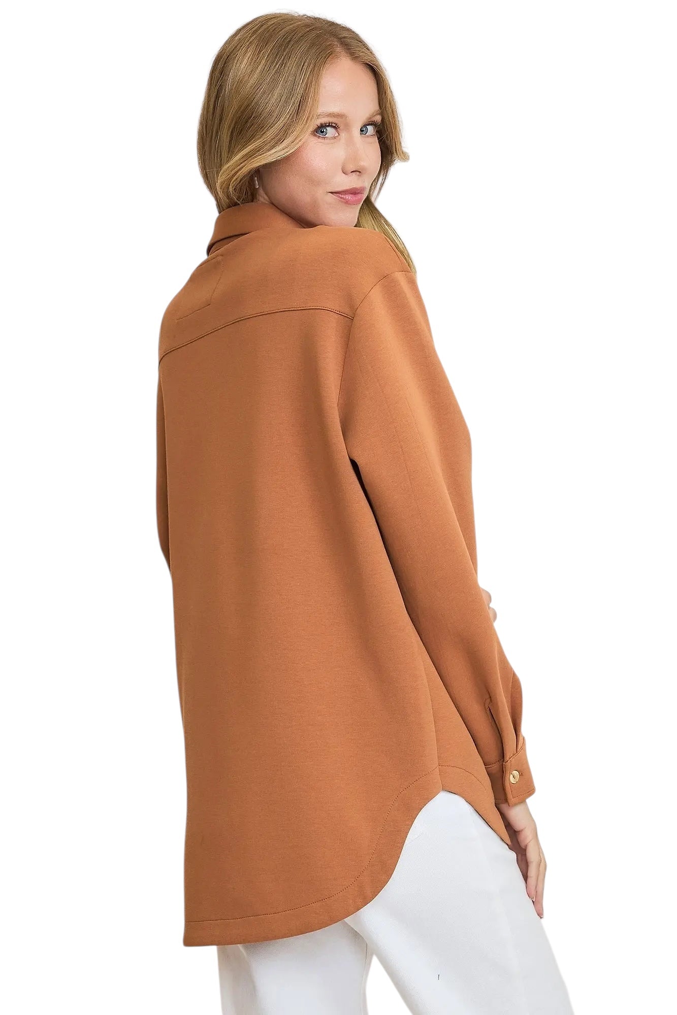 This Feels Right Bronze Top is a versatile essential crafted from an exceptionally soft, luxurious fabric that transitions seamlessly from layering piece to standalone statement. The classic button-down silhouette features a refined collar and long sleeves, offering polished sophistication whether worn open over your favorite pieces or buttoned as a complete top. Its neutral bronze tone pairs effortlessly with any wardrobe, making it the perfect foundation for elevated everyday styling or layered elegance.