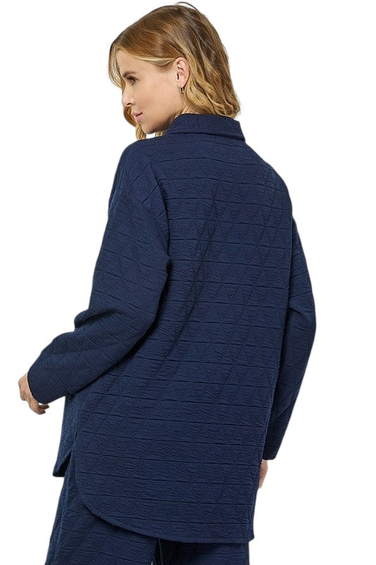 The On My Side Navy Jacket combines the classic style of a button-down shirt with the warmth of a quilted jacket. Crafted in a rich navy hue, it offers a sleek, sophisticated silhouette that layers effortlessly over your outfits. Perfect for transitional weather, this jacket provides subtle insulation without compromising elegance, making it an ideal choice for a polished, refined look.