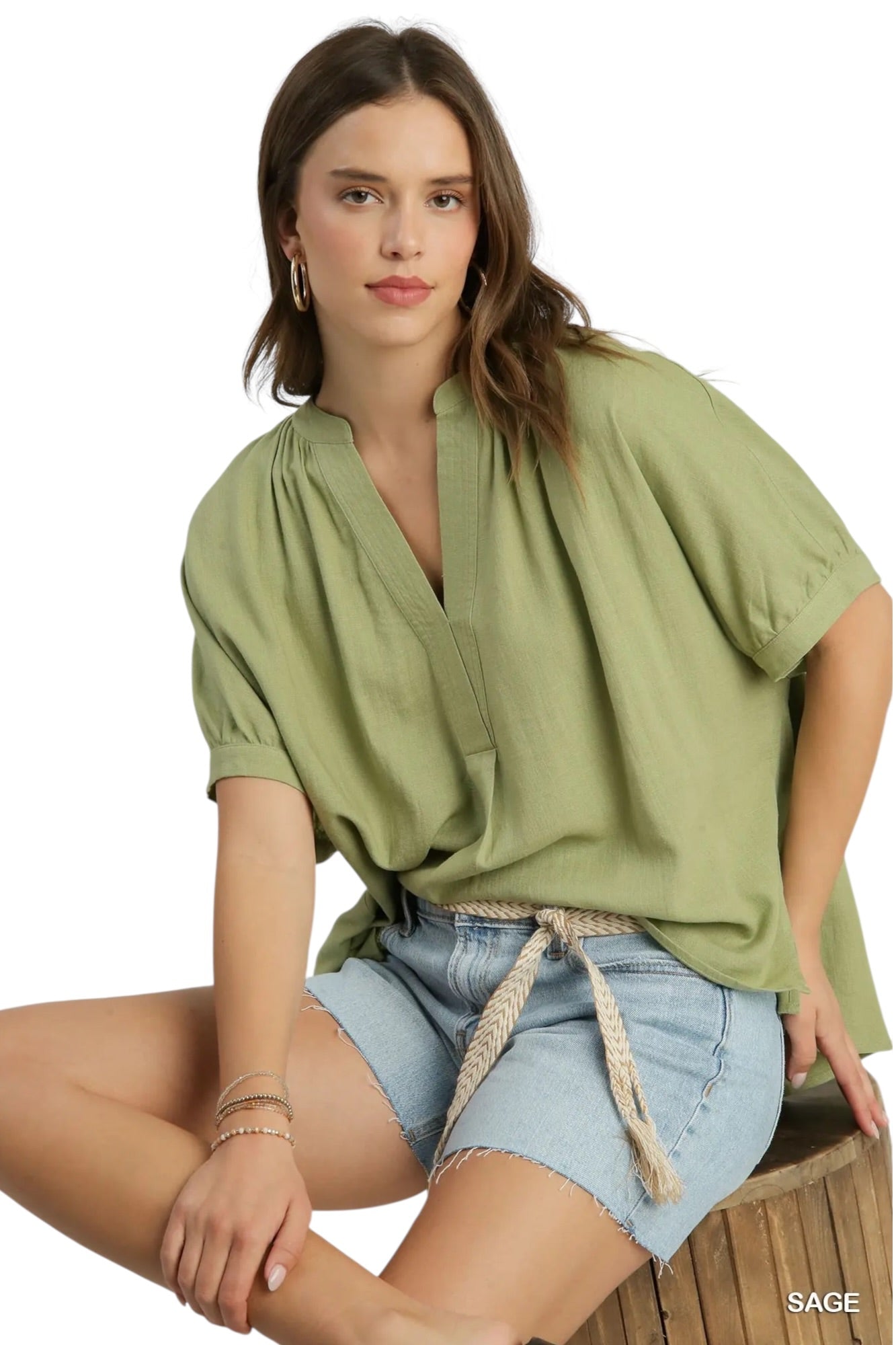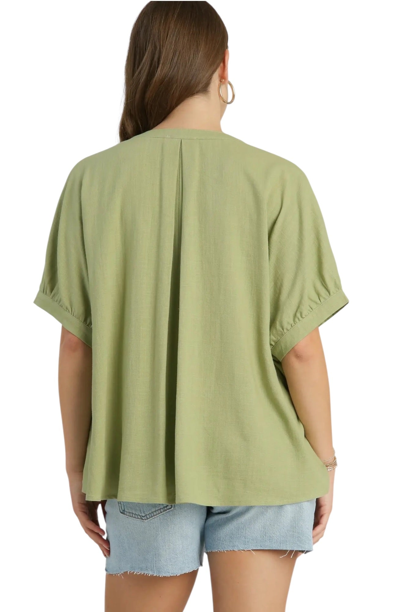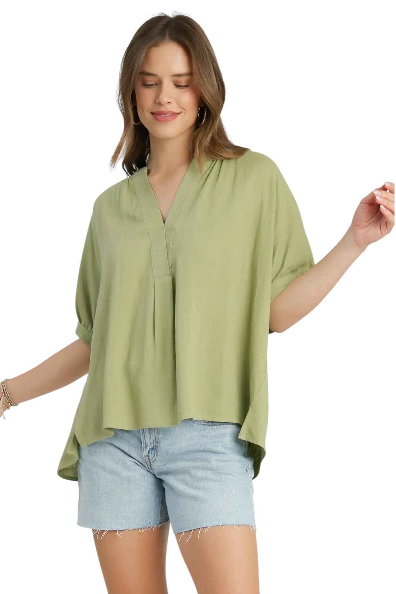 Meet your new go-to piece. The Wait For The Call Sage Top is designed to feel as good as it looks—crafted in breathable linen with an oversized boxy silhouette that flatters every frame. The V-neckline and thoughtful stitch detailing elevate the simple design, while short sleeves keep you comfortable season after season. In a calming sage tone, it's your canvas for effortless styling: throw it on with your favorite jeans and sandals for an outfit that feels intentional yet relaxed. This is the kind of top you'll reach for again and again.