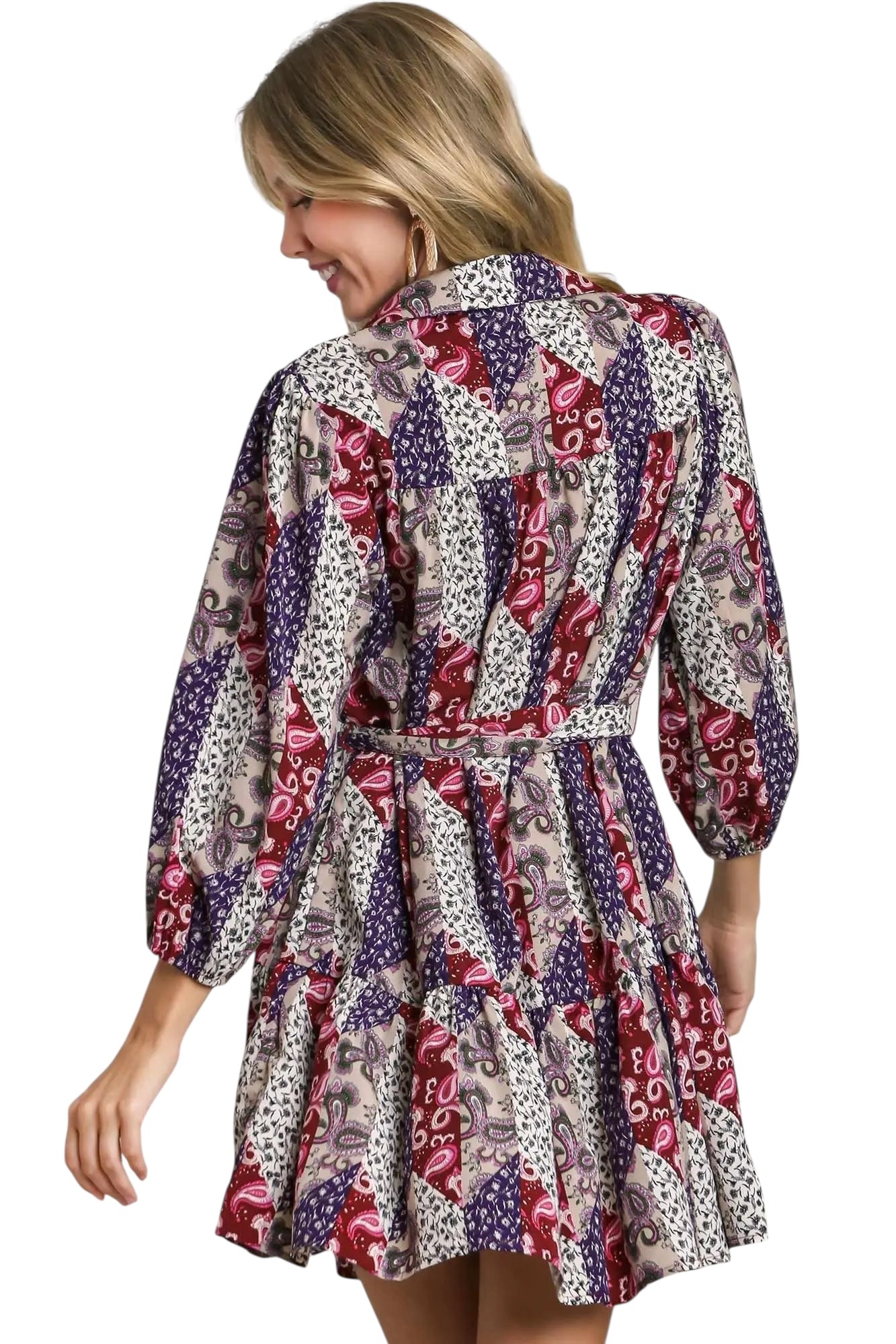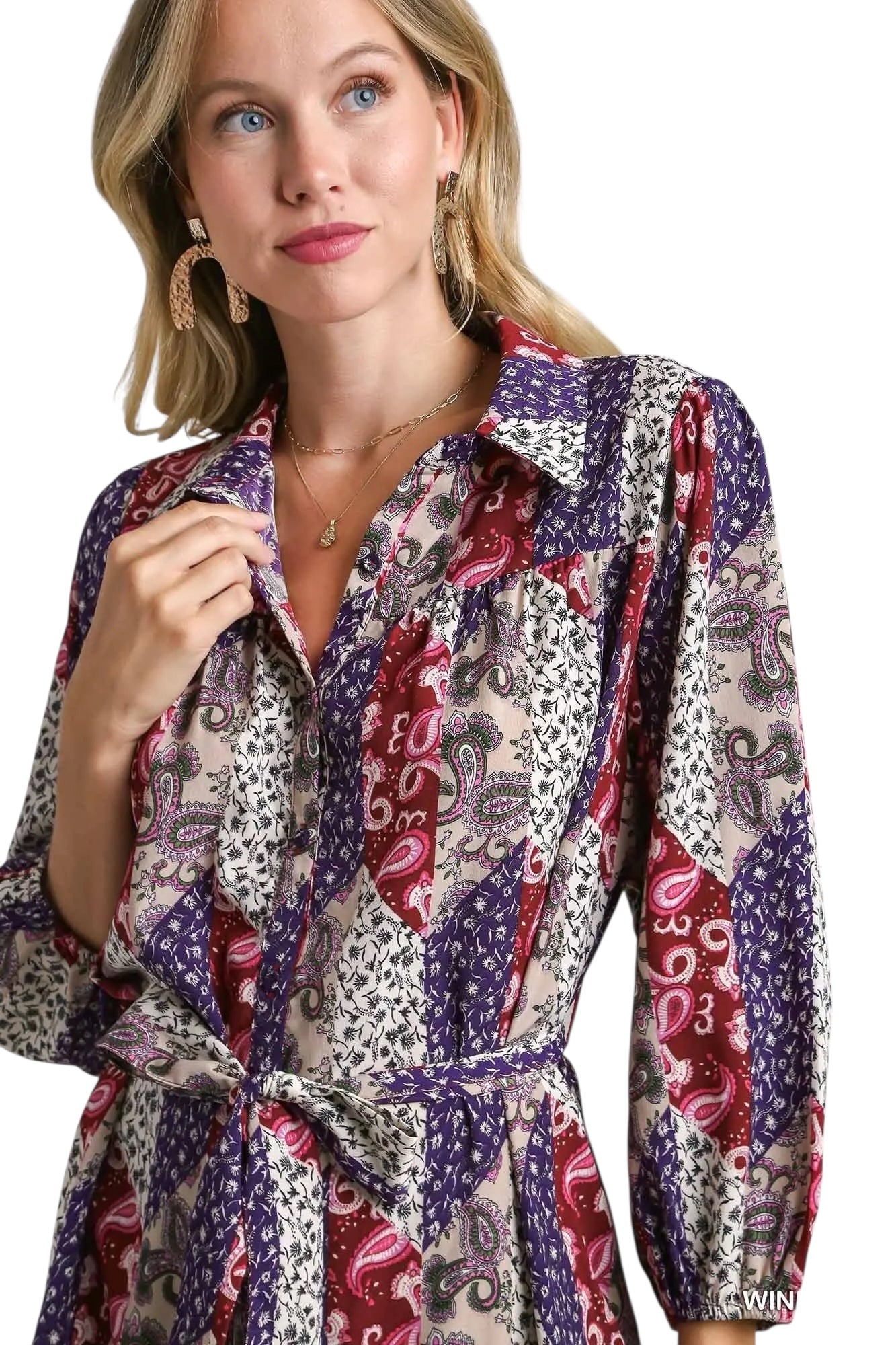 Elevate your everyday wardrobe with this refined button-down dress, featuring a classic collar and long sleeves for timeless sophistication. The striking mixed print blends magenta, black, navy, and white in a balanced composition that transitions seamlessly from office to evening. Versatile enough to dress up with heels or down with sneakers, this piece delivers polished style with effortless versatility.